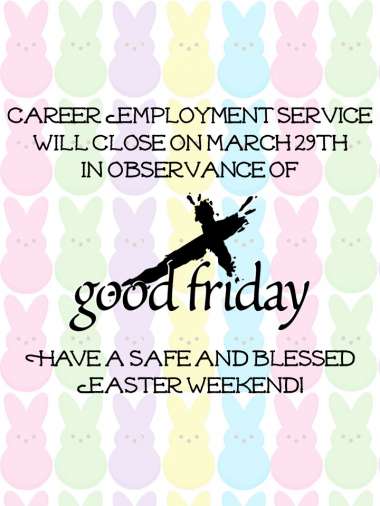 Good Friday by Career Employment SBM | Jun 17, 2024 | The Latest | 0 comments Career Employment Service will close on March 29th in observance of Good Friday. Have a safe and blessed Easter weekend! Submit a Comment Cancel replyYour email address will not be published. Required fields are marked *Comment * Name * Email * Website Save my name, email, and website in this browser for the next time I comment. Δ